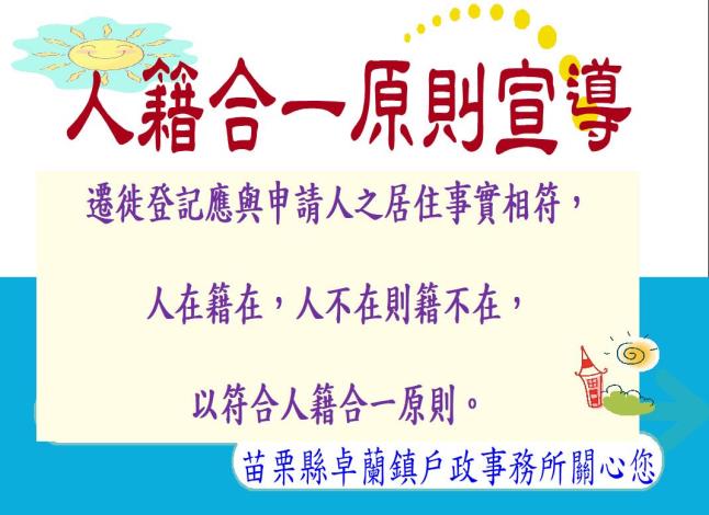 請民眾依居住事實辦理遷徙登記,以符合『人籍合一』原則, 並正確戶籍資料。